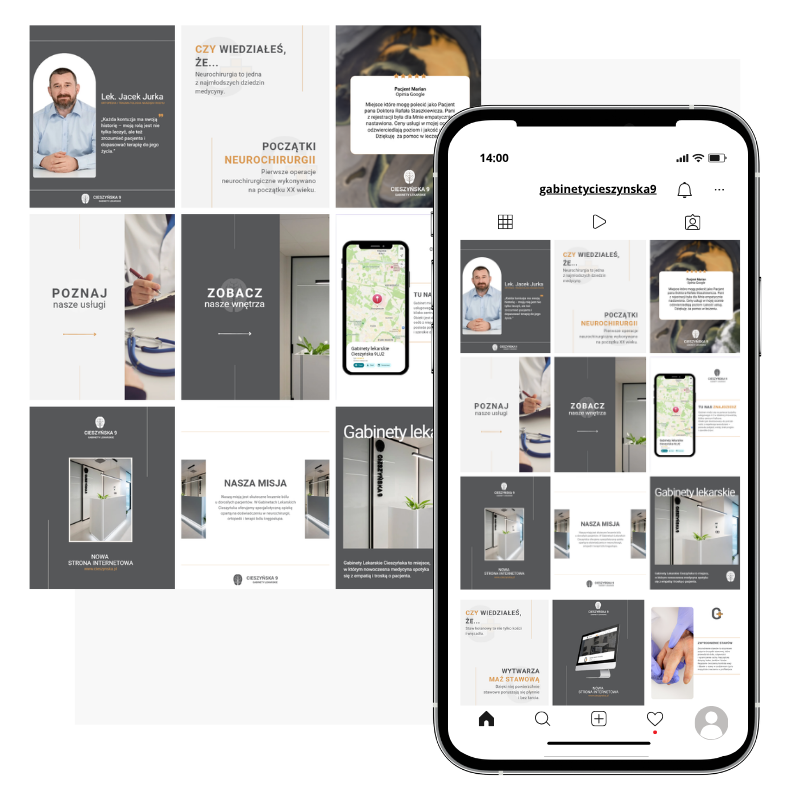 Za komunikację w mediach społecznościowych Gabinetów Cieszyńska 9 odpowiada agencja Solutio Medica, specjalizująca się w marketingu medycznym. W ramach współpracy prowadzimy profile placówki na Facebooku i Instagramie, dbając o spójny wizerunek, edukację pacjentów oraz budowanie zaufania do zespołu specjalistów. To przykład kompleksowego podejścia Solutio Medica do promocji nowoczesnych gabinetów medycznych w przestrzeni online.