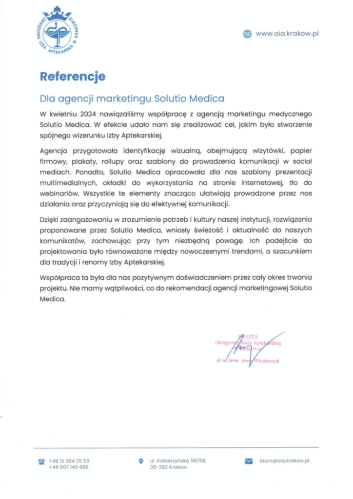 „Dzięki zaangażowaniu i zrozumieniu naszej specyfiki, rozwiązania proponowane przez Solutio Medica wniosły świeżość i nowoczesność, zachowując powagę i szacunek dla tradycji Izby Aptekarskiej.