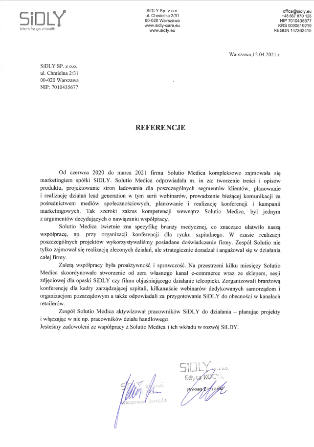 „Zespół Solutio Medica wykazuje się wysoką etyką pracy, terminowością i kreatywnością.