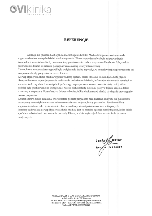 Współpraca przebiega bez zastrzeżeń – z pełnym zaufaniem rekomendujemy Solutio Medica jako solidnego partnera w zakresie marketingu medycznego.”